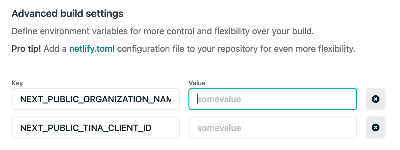 NEXT_PUBLIC_USE_LOCAL_CLIENT to 0.NEXT_PUBLIC_ORGANIZATION_NAME to your Tina Cloud organization nameNEXT_PUBLIC_TINA_CLIENT_ID to the Client ID displayed in your Tina Cloud App.NEXT_PUBLIC_SHOW_EDIT_BTN to 0 or 1, 0 means there is no "enter edit mode" and you will have to visit /admin to enter edit mode.Restart your server and run yarn dev again.