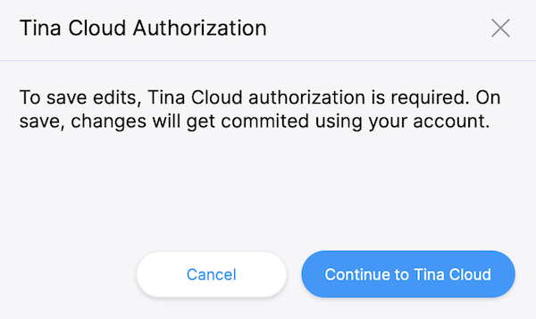 This time a modal asks you to authenticate through Tina Cloud. Upon success, your edits will be sent to the cloud server (and subsequently to GitHub).